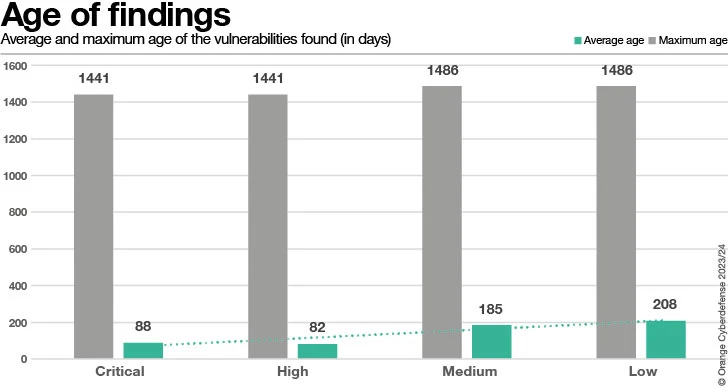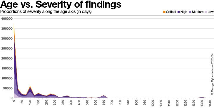 De meerderheid van de bevindingen (78%) die als ‘kritisch’ of ‘hoog’ zijn beoordeeld, zijn 30 dagen of jonger (wanneer wordt gekeken naar een periode van 120 dagen). Omgekeerd is 18% van alle bevindingen met de classificatie ‘Kritisch’ of ‘Hoog’ 150 dagen of ouder. Vanuit een prioriteringsperspectief lijken ‘kritieke’ of ‘hoge’ reële bevindingen snel te worden afgehandeld, maar er blijft in de loop van de tijd nog steeds een restant achter. We zien daarom dat onopgeloste bevindingen steeds ouder worden. ~35% van alle unieke CVE’s zijn afkomstig van bevindingen van 120 dagen of ouder.