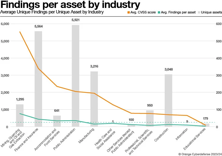 Op vergelijkbare wijze overschreden ook de financiële en verzekeringssector met accommodatie- en voedseldiensten het algemene gemiddelde met respectievelijk 10,2 en 3,4 bevindingen per unieke asset. Dezelfde drie bedrijfstakken overschreden het algehele gemiddelde voor bevindingen die als kritiek werden beoordeeld, waarbij accommodatie- en voedselservers dit met bijna een factor 3 deden.
