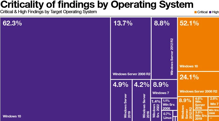 De hoge gemiddelde aantallen ‘Kritieke’ en ‘Hoge’ bevindingen worden grotendeels beïnvloed door assets met Microsoft Windows- of Microsoft Windows Server-besturingssystemen. Activa waarop andere besturingssystemen dan Microsoft draaien, zoals op Linux gebaseerde besturingssystemen, zijn aanwezig, maar deze worden verhoudingsgewijs veel minder gerapporteerd.