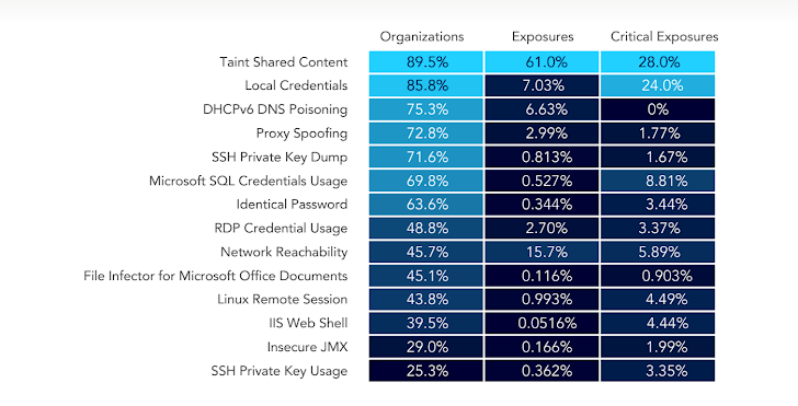 Het rapport maakt dus duidelijk dat het patchen van kwetsbaarheden weliswaar belangrijk is, maar niet voldoende. Meer voorkomende bedreigingen, zoals aanvallers die gedeelde mappen vergiftigen met kwaadaardige code (gedeelde inhoud besmetten) en gemeenschappelijke lokale inloggegevens op meerdere apparaten gebruiken, leggen een veel groter deel van de kritieke activa bloot (24%) vergeleken met CVE's.