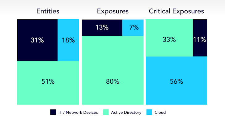 Het rapport analyseert bijvoorbeeld de verdeling van potentiële aanvalspunten over omgevingen, waarbij wordt vastgesteld dat niet alle entiteiten kwetsbaar zijn (zie onderstaande grafiek). Een meer kritische maatstaf is de blootstelling aan kritieke activa. Cloudomgevingen bevatten de meest kritieke activaposities, gevolgd door Active Directory (AD) en IT-/netwerkapparaten.