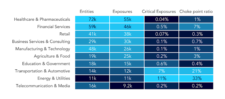 Het rapport analyseert ook de verschillende cyberveiligheidsrisico’s in verschillende sectoren. Industrieën met een groter aantal entiteiten (potentiële aanvalspunten) hebben doorgaans meer kwetsbaarheden. De gezondheidszorg heeft bijvoorbeeld vijf maal zoveel blootstelling als energie en nutsvoorzieningen.