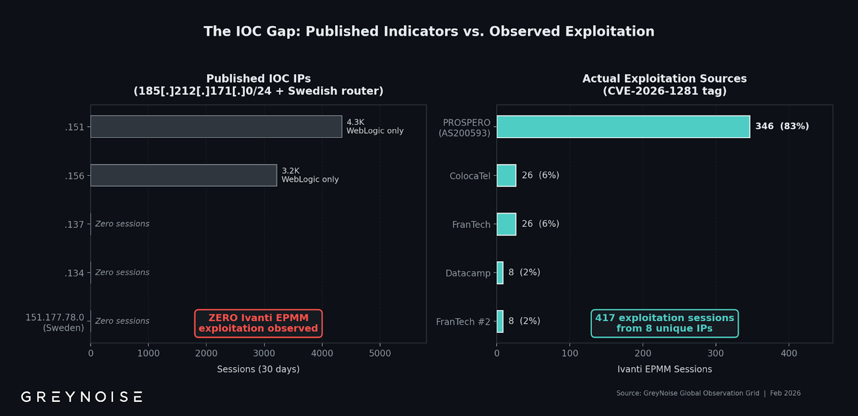 Bedreigingsinformatiebedrijf GreyNoise zei dat het tussen 1 en 9 februari 2026 417 exploitatiesessies van 8 unieke bron-IP-adressen heeft geregistreerd. Naar schatting 346 exploitatiesessies zijn afkomstig van 193.24.123(.)42, goed voor 83% van alle pogingen.