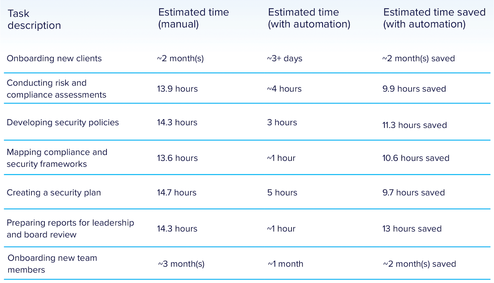 Voor meer inzichten in de praktijk in hoeveel tijdautomatisering kan opslaan in belangrijke cybersecurity-functies, verkennen De handleiding van de serviceprovider voor het automatiseren van cybersecurity en compliance management. Het omvat praktische voorbeelden en een eenvoudige formule om ROI in zowel uren als dollars te berekenen, zodat u onmiddellijk de meetbare voordelen kunt zien die automatisering kan bieden.