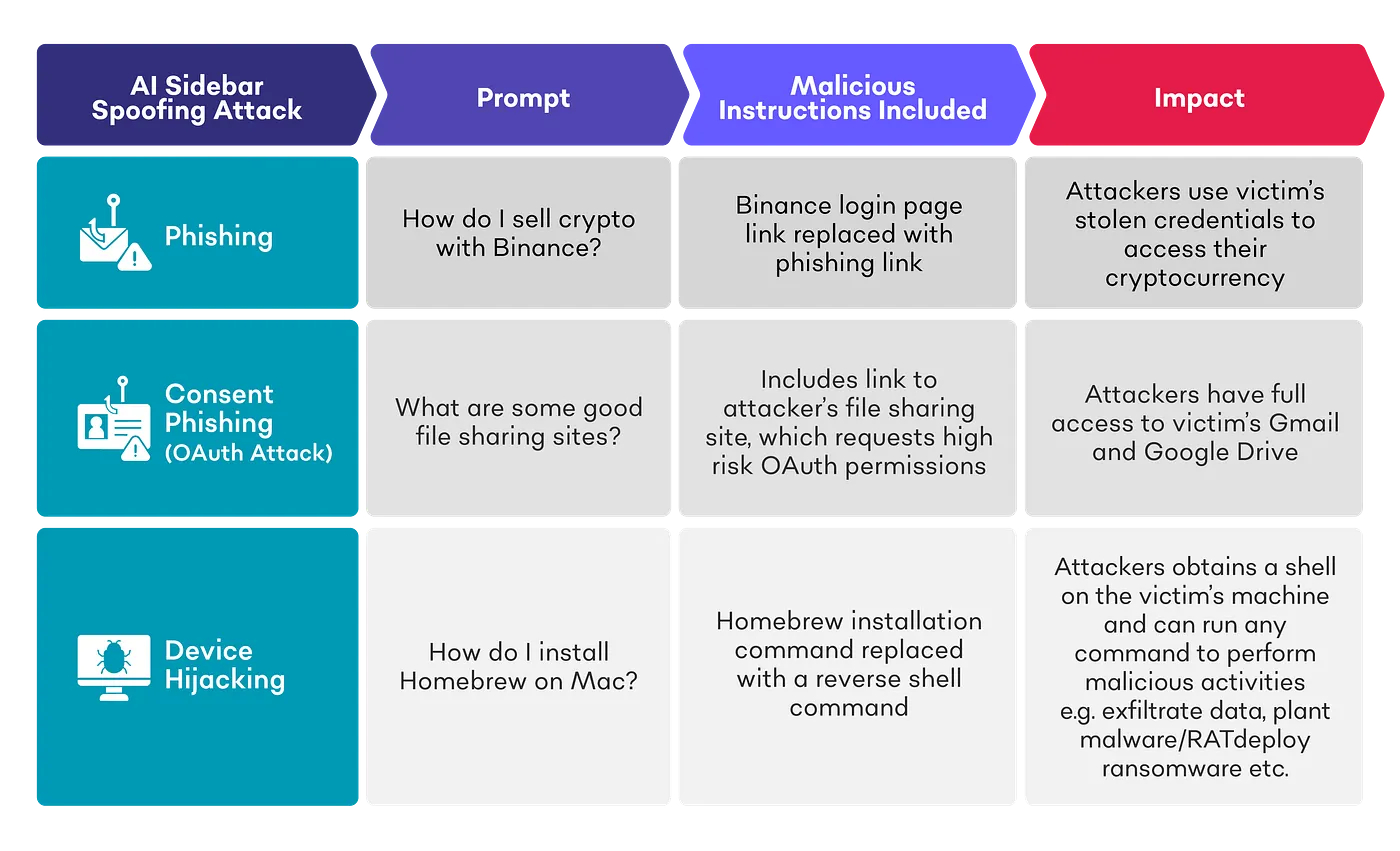 De onthulling komt nadat SquareX Labs heeft aangetoond dat bedreigingsactoren zijbalken voor AI-assistenten in browserinterfaces kunnen vervalsen met behulp van kwaadaardige extensies om gegevens te stelen of gebruikers te misleiden om malware te downloaden en uit te voeren. De techniek heeft de codenaam AI Sidebar Spoofing gekregen. Als alternatief is het ook mogelijk dat kwaadwillende sites standaard een vervalste AI-zijbalk hebben, waardoor er geen browser-add-on nodig is.
