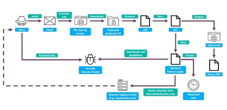 “Met deze code is de dreigingsacteur vervolgens in staat om de VS-code externe tunnel te verifiëren en op afstand toegang te krijgen tot het bestandssysteem en willekeurige opdrachten uit te voeren via de ingebouwde Visual Studio Terminal op de beoogde host,” zei Proofpoint.