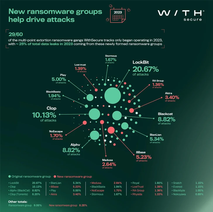 De steeds evoluerende aard van het ransomware-landschap wordt verder bewezen door het feit dat 29 van de 60 momenteel actieve ransomware-groepen dit jaar met hun activiteiten zijn begonnen, volgens WithSecure, deels als gevolg van de broncodelekken van Babuk, Conti en LockBit door de jaren heen. .