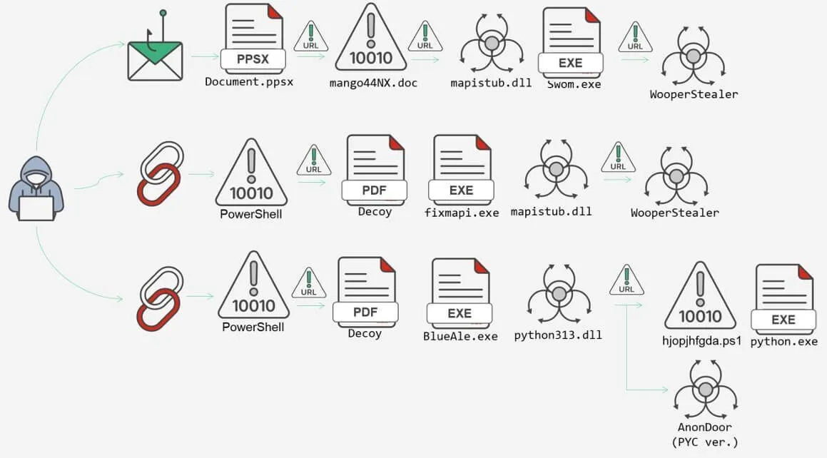 Een daaropvolgende aanvalsgolf waargenomen in maart 2025 is gebleken om Windows Shortcut (.LNK) -bestanden te gebruiken om de kwaadwillende WoperStealer DLL te ontketenen, opnieuw gelanceerd met behulp van DLL-side-loading, om gevoelige gegevens van gecompromitteerde hosts te stelen.