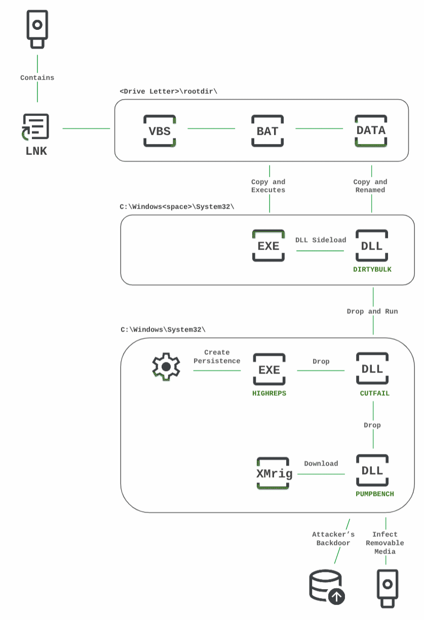 De aanvalsketen begint wanneer een slachtoffer wordt misleid in het uitvoeren van een Windows -snelkoppeling (LNK) in de gecompromitteerde USB -drive. Het LNK -bestand resulteert in de uitvoering van een visuele basiscript dat ook in dezelfde map is gelegen. Het script van zijn kant lanceert een batchscript om de infectie te initiëren –