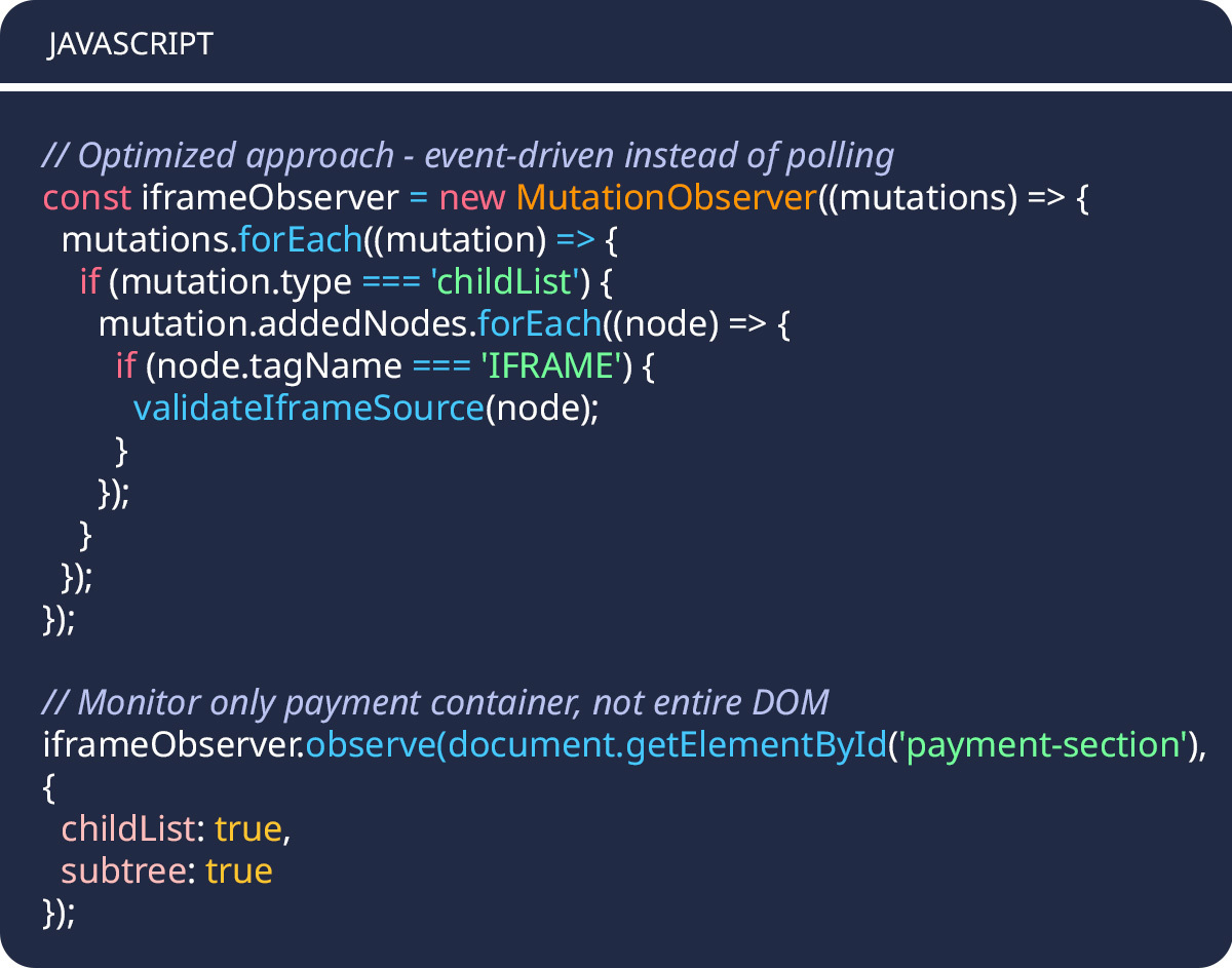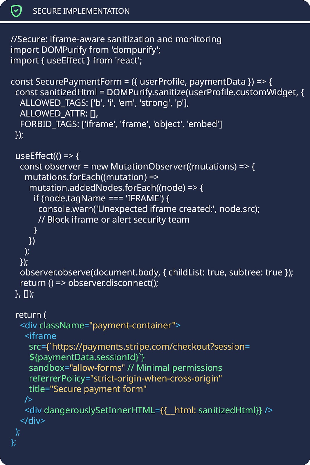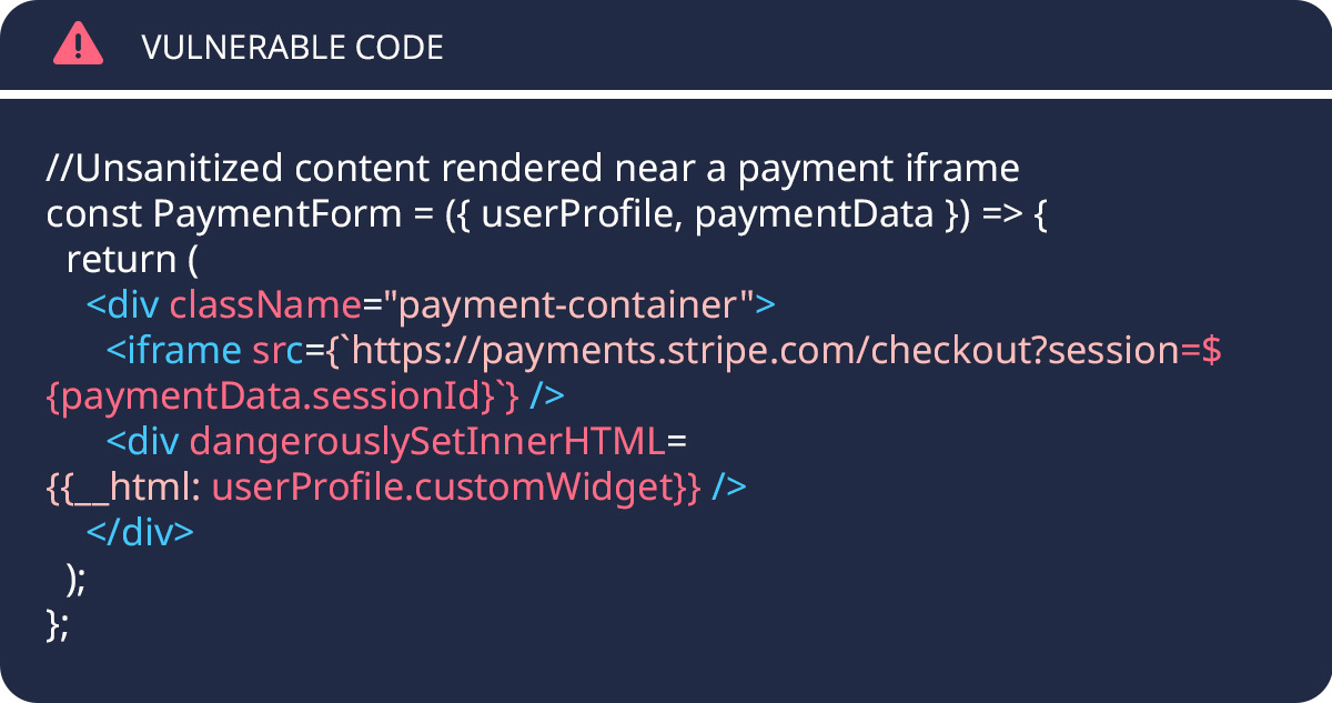 Het gebruik van gevaarlijksetinnerhtml in de buurt van een betaling IFRAME creëert kansen voor aanvallers om verborgen IFRAMES te injecteren die betalingsgegevens oogsten via event -luisteraars of communicatie manipuleren tussen het betaling IFRAME en het oudervenster.