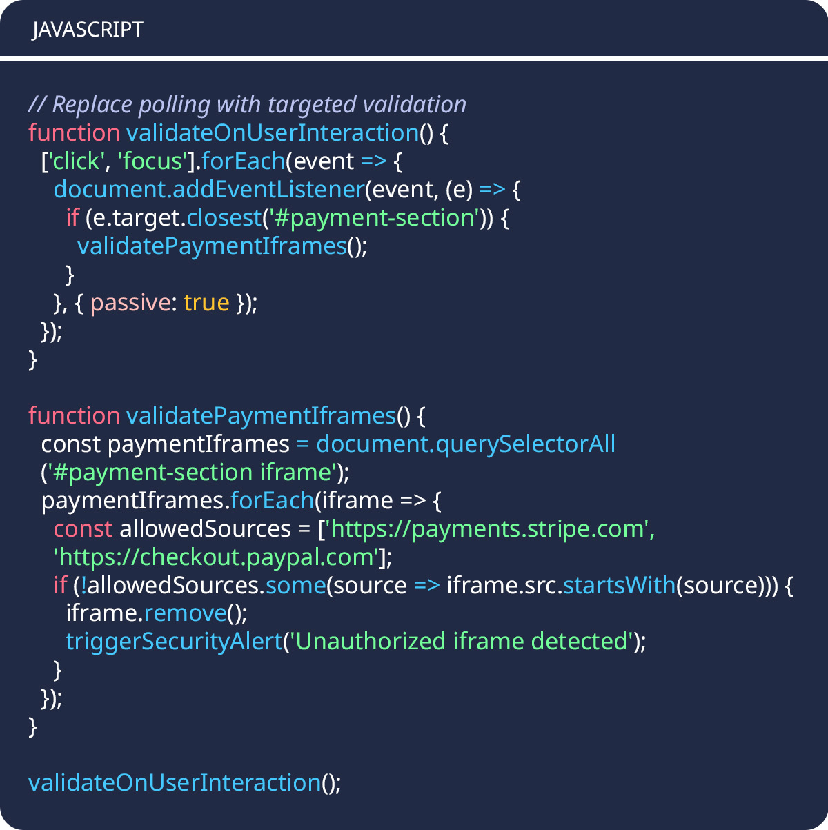 Prestatie -impact: vermindert validatie overhead met behoud van de effectiviteit van de beveiliging door alleen te activeren op gebruikersinteractie met betalingselementen.
