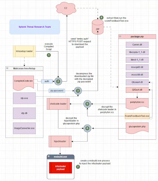 De aanval “maakt gebruik van Inno Setup’s Pascal Scripting-mogelijkheden om de payload op de volgende fase op te halen en uit te voeren in een gecompromitteerde of gerichte gastheer,” zei het onderzoeksteam van Splunk Threat. “Deze techniek lijkt sterk op de aanpak die wordt gebruikt door een bekende kwaadwillende Inno Setup-lader genaamd D3F@CK Loader, die een vergelijkbaar infectiepatroon volgt.”