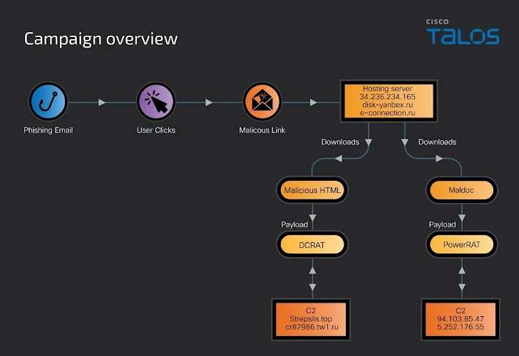 Russischsprekende gebruikers zijn het doelwit geworden van een nieuwe phishing-campagne die gebruik maakt van een open-source phishing-toolkit genaamd Gophish om DarkCrystal RAT (ook bekend als DCRat) en een voorheen ongedocumenteerde trojan voor externe toegang genaamd PowerRAT te leveren.