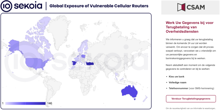 Het Franse cybersecuritybedrijf Sekoia zei dat de aanvallers de API van de Cellular Router exploiteren om kwaadaardige SMS -berichten te verzenden die phishing -URL’s bevatten, waarbij de campagnes voornamelijk gericht zijn op Zweden, Italië en België met behulp van typosquat -URL’s die overheidsplatforms zoals CSAM en Ebox, evenals bankieren, post- en telecomproviders.