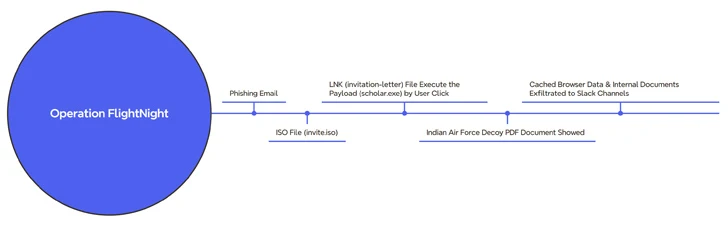 Tegelijkertijd wordt aan het slachtoffer een pdf-bestand getoond dat beweert een uitnodigingsbrief van de Indiase luchtmacht te zijn, terwijl de malware clandestien documenten en in de cache opgeslagen webbrowsergegevens verzamelt en deze doorstuurt naar een door een acteur bestuurd Slack-kanaal genaamd FlightNight.