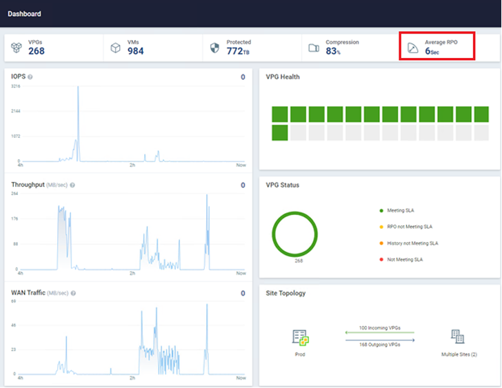 Zerto, een bedrijf van Hewlett Packard Enterprise, kan u helpen ransomware in vrijwel realtime te detecteren en te herstellen. Deze oplossing maakt gebruik van continue gegevensbescherming (CDP) om ervoor te zorgen dat alle werklasten de laagst mogelijke herstelpuntdoelstelling (RPO) hebben. Het meest waardevolle van CDP is dat het geen gebruik maakt van snapshots, agenten of andere periodieke gegevensbeschermingsmethoden. Zerto heeft geen invloed op de productieworkloads en kan RPO's in de regio van 5-15 seconden realiseren op duizenden virtuele machines tegelijk. De omgeving in de onderstaande afbeelding heeft bijvoorbeeld bijna 1.000 VM's die worden beschermd met een gemiddelde RPO van slechts zes seconden!