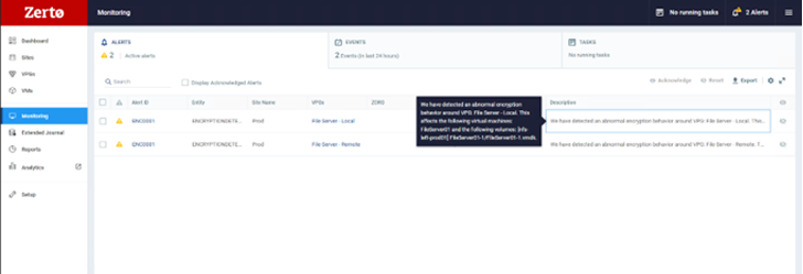 Zerto kan mogelijke ransomware-aanvallen in realtime detecteren, in tegenstelling tot andere producten die moeten wachten tot een back-up is voltooid voordat de gegevens worden gescand. Zerto scant gegevens in-line in realtime terwijl deze worden gerepliceerd, waardoor u het eerste waarschuwingssignaal krijgt van een mogelijke cyberaanval in uw omgeving.