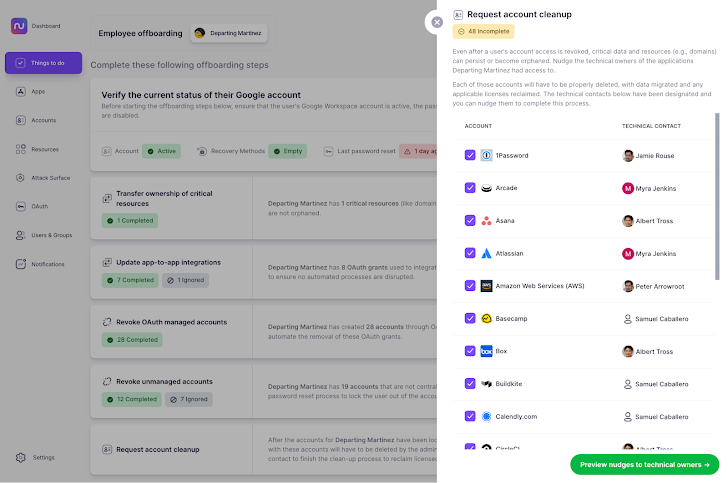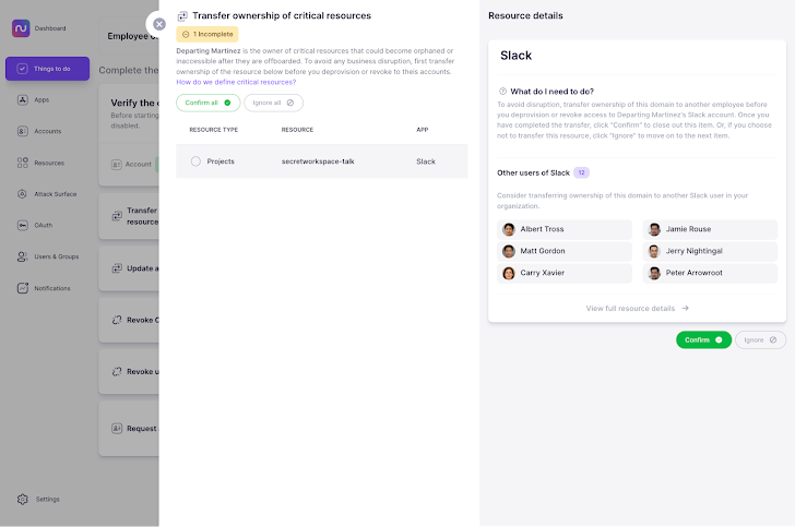 Nudge Security identificeert automatisch kritieke bronnen die eigendom zijn van uw vertrekkende medewerker en begeleidt u bij het overdragen van het eigendom aan andere teamleden. Voor elke bron biedt Nudge Security gedetailleerde instructies met nuttige links en een overzicht van andere app-gebruikers die de verantwoordelijkheid voor elke bron kunnen overnemen. Terwijl u de lijst doorloopt, kunt u bevestigen dat u het eigendom hebt overgedragen of uw beslissing vastleggen om een ​​bepaalde bron te negeren die niet hoeft te worden overgedragen.