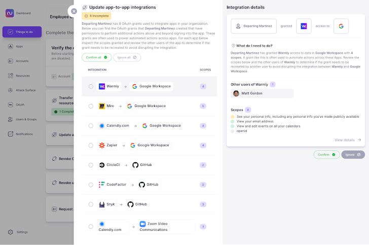 Nudge Security toont u alle app-to-app OAuth-toekenningen en -bereiken voor de vertrekkende medewerker, zodat u de potentiële zakelijke impact van elke integratie kunt beoordelen en kunt bepalen of deze opnieuw moet worden gemaakt met een ander account. U ziet ook wie de andere gebruikers van die applicatie zijn, zodat u ze indien nodig kunt betrekken. Deze stap van het offboardingproces zorgt ervoor dat geautomatiseerde bedrijfsprocessen blijven werken zoals verwacht nadat de medewerker de organisatie heeft verlaten.