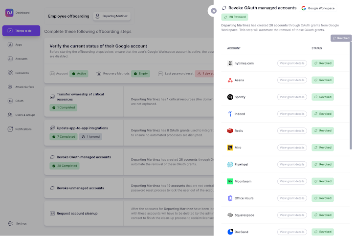 Met OAuth-toekenningen kunnen werknemers eenvoudig nieuwe accounts maken door eenvoudigweg de optie te kiezen om zich te authenticeren met Google Workspace of Microsoft 365. Nudge Security maakt het voor beveiligings- en IT-teams net zo gemakkelijk om de OAuth-toekenningen van vertrekkende gebruikers rechtstreeks vanuit Nudge Security te identificeren en in te trekken . Nu u de bereiken met betrekking tot app-naar-app-integraties al heeft gecontroleerd en opnieuw hebt gemaakt, kunt u de resterende app-toegang die via OAuth is verleend, intrekken.
