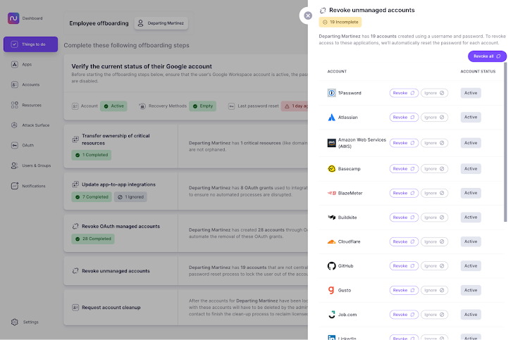 En een ingebouwd draaiboek leidt u door een uitgebreide checklist voor IT-offboarding, in overeenstemming met de best practices van Google en Microsoft. Met het draaiboek kunt u tot 90 procent van de tijd en moeite besparen die gepaard gaat met SaaS-offboarding door tijdrovende, gemakkelijk te missen taken te automatiseren, zoals het intrekken van OAuth-toekenningen en het opnieuw instellen van wachtwoorden voor accounts buiten Single Sign-On (SSO).