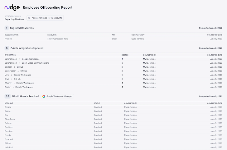 Nudge Security is een SaaS-beheerplatform voor modern IT-beheer en beveiliging. Het ontdekt elk cloud- en SaaS-account dat ooit door iemand in uw organisatie is aangemaakt, inclusief generatieve AI-apps, waardoor u één enkele bron van waarheid krijgt voor de accounts van vertrekkende gebruikers en OAuth-toekenningen die moeten worden uitgeschreven, ingetrokken of overgedragen.
