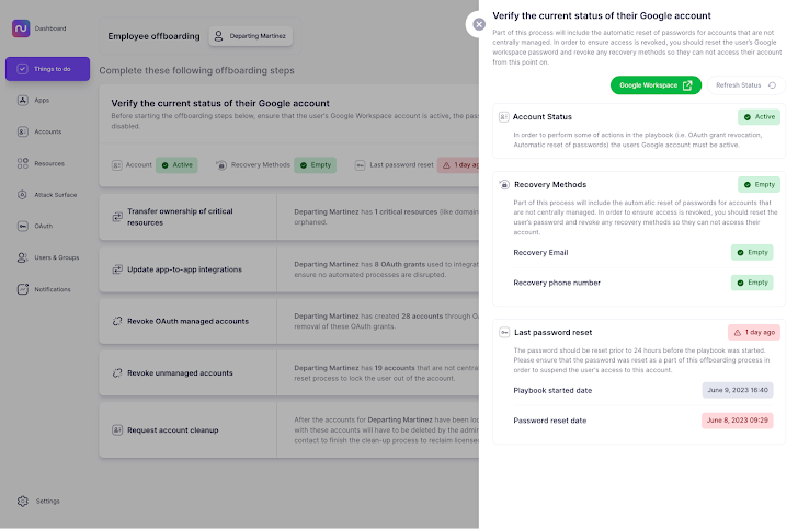 In eerste instantie wilt u dat het Google- of Microsoft-account van de werknemer actief blijft terwijl u andere offboarding-taken uitvoert. U moet er echter voor zorgen dat de gebruiker geen toegang meer heeft tot het account door het wachtwoord opnieuw in te stellen en eventuele herstelmethoden uit te schakelen. Nudge Security helpt u de status van elk van deze stappen te verifiëren, zodat u zeker weet dat de toegang is ingetrokken.
