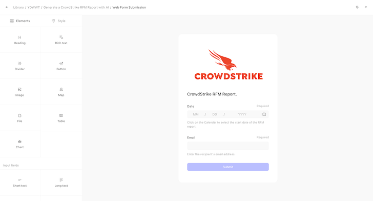 De workflow wordt gestart wanneer een webformulier wordt ingediend, waardoor het proces wordt geactiveerd om CrowdStrike RFM-rapporten te genereren.