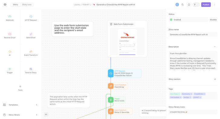 De workflow van Tom automatiseert het volgen en rapporteren van Falcon Sensor RFM over hosts. Door gebruik te maken van de AI-gestuurde automatische modus van Tines wordt aangepaste code gegenereerd om het maken van rapporten te stroomlijnen. De workflow produceert niet alleen regelmatige, consistente rapporten, maar stelt het management ook in staat trends in RFM-voorvallen te monitoren, ter ondersteuning van proactief systeemgezondheidsbeheer en snellere besluitvorming.