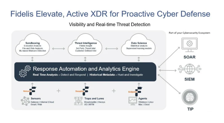 Fidelis NDR maakt gebruik van veel functies op het hele platform om realtime detectie en respons te realiseren. Deep Session Inspection (DSI) en decodering, Deep Packet Inspection (DPI), Antivirusdetectie (AV) en DNS-protocolafwijkingsdetectie op netwerk- en mailsensoren bieden een veelzijdige benadering van netwerkgebaseerde detectie. Op gebeurtenissen en sequenties gebaseerde detecties, evenals anomaliedetecties, worden uitgevoerd met behulp van de Fidelis Collector, een realtime database van alle gedecodeerde sessie- en objectmetagegevens die worden verzameld terwijl deze het netwerk doorkruist. Bovendien detecteert Fidelis Endpoint kwaadaardige objecten, verkeersstromen en gedrag op eindpunten als er een agent is geïnstalleerd.