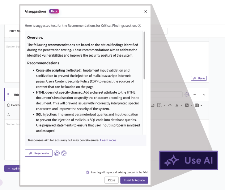 • Pentest/Offensieve beveiligingsrapportage: Net als GPT -tools die u helpen een e -mail te schrijven, kunt u generatieve AI gebruiken om pentestrapporten te versnellen. PlexTrac, een toonaangevend Pentest -rapportageplatform, integreert AI om exploit -bevindingen te genereren, gegevens samen te vatten en zelfs de samenvattingen van het concept voor rapporten. Maar je moet er natuurlijk voor zorgen dat het platform dat je heft, je gegevens veilig houdt. De inlandse AI-oplossing van PlexTrac werkt in een vooraf opgeleide capaciteit. Het systeem en de onderliggende componenten leren niet in de loop van de tijd of behouden gebruikersinzendingen buiten de vereiste om de inzending te verwerken en een generatief antwoord te geven.