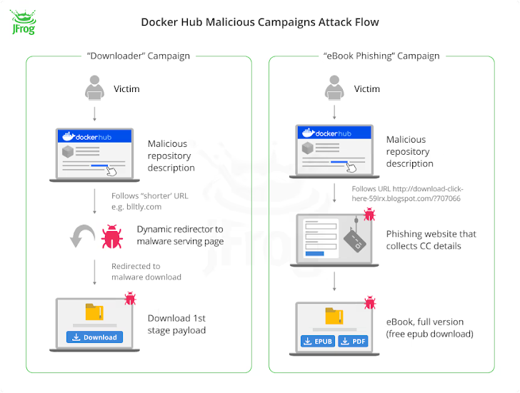 Van de 4,79 miljoen beeldloze Docker Hub-repository's die zijn blootgelegd, zouden er 3,2 miljoen zijn gebruikt als landingspagina's om nietsvermoedende gebruikers door te sturen naar frauduleuze sites als onderdeel van drie brede campagnes: