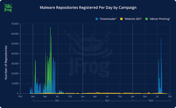 - Downloader (opslagplaatsen gemaakt in de eerste helft van 2021 en september 2023), die links adverteert naar vermeende illegale inhoud of cheats voor videogames, maar ofwel rechtstreeks links naar kwaadaardige bronnen bevat, ofwel een legitieme bron bevat die op zijn beurt JavaScript-code bevat die doorverwijst naar de kwaadaardige lading na 500 milliseconden.