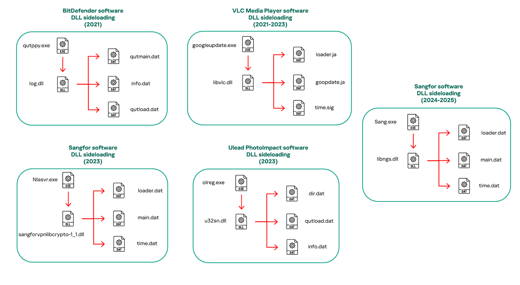 Tussen 2021 en 2025 zou Mustang Panda voor dit doel ondertekende binaire bestanden van verschillende softwareproducten hebben gebruikt, waaronder Bitdefender (“qutppy.exe”), VLC Media Player (“vlc.exe” omgedoopt tot “googleupdate.exe”), Ulead PhotoImpact (“olreg.exe”) en Sangfor (“sang.exe”).