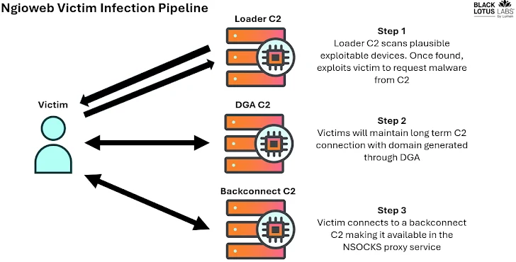Uit de laatste onthullingen van LevelBlue en Lumen blijkt dat de systemen die zijn geïnfecteerd met de Ngioweb-trojan, worden verkocht als residentiële proxyservers voor NSOCKS, die eerder door bedreigingsactoren is gebruikt bij aanvallen op het vullen van inloggegevens gericht op Okta.