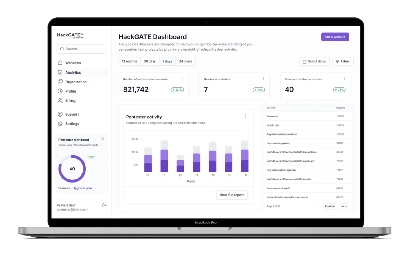 HackGATE biedt realtime inzicht in pentest-activiteiten. Het geeft bijvoorbeeld details over het beveiligingstestverkeer dat naar doelen wordt gestuurd, belicht gerichte testgebieden en schetst de methoden die door ethische hackers worden gebruikt. Deze transparantie zorgt ervoor dat u het beveiligingstestproces effectief kunt volgen.