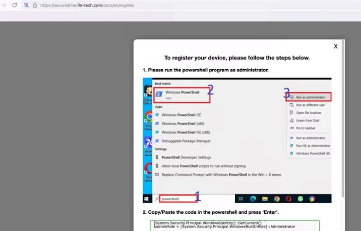 Om het vermeende PDF -document te lezen, worden slachtoffers overtuigd om te klikken op een URL met een lijst met stappen om hun Windows -systeem te registreren. De registratielink dringt er bij hen op aan PowerShell als beheerder te starten en het weergegeven codefragment in de terminal te kopiëren/plakken en deze uit te voeren.