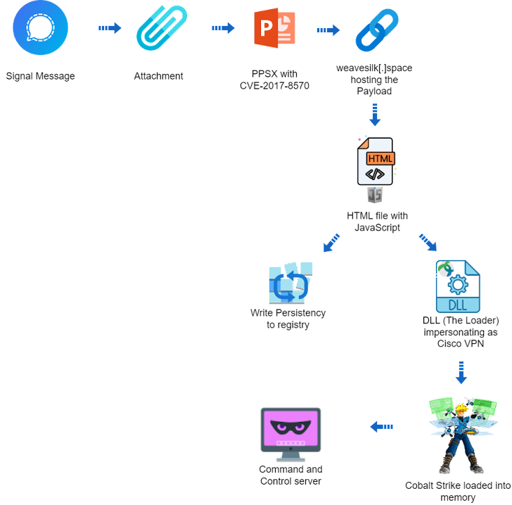 De aanvalsketen, die volgens Deep Instinct eind 2023 plaatsvond, gebruikt een PowerPoint-diavoorstellingbestand (“signal-2023-12-20-160512.ppsx”) als uitgangspunt, waarbij de bestandsnaam impliceert dat het mogelijk gedeeld via de Signal-app voor instant messaging.