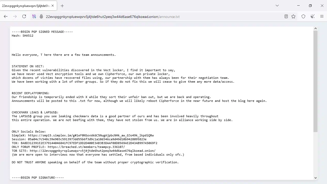 Het noemde LAPSUS$ ook een “goede partner van ons en is nauw betrokken geweest bij deze hele operatie.” De groep benadrukte ook dat ze “nooit VECT-encryptietools hebben gebruikt en dat we CipherForce bezitten, ons eigen privékluisje”, naar aanleiding van een rapport van Check Point Research over kwetsbaarheden die ontdekt zijn in het encryptieproces van de ransomware.
