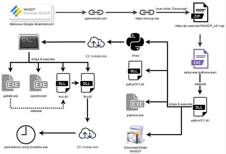 De DLL downloadt op zijn beurt een legitiem WinSCP-installatieprogramma en voert dit uit om de list in stand te houden, terwijl het heimelijk Python-scripts (“slv.py” en “wo15.py”) op de achtergrond laat vallen om het kwaadaardige gedrag te activeren. Het is ook verantwoordelijk voor het opzetten van persistentie.