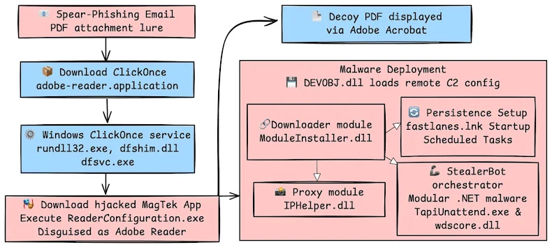 De ClickOnce-applicatie is een legitiem uitvoerbaar bestand van MagTek Inc. (“ReaderConfiguration.exe”) dat zich voordoet als Adobe Reader en is ondertekend met een geldige handtekening om te voorkomen dat er waarschuwingen worden gegenereerd. Bovendien zijn verzoeken aan de command-and-control (C2)-server regiogebonden voor Zuid-Azië en wordt het pad voor het downloaden van de payload dynamisch gegenereerd, wat de analyse-inspanningen bemoeilijkt.