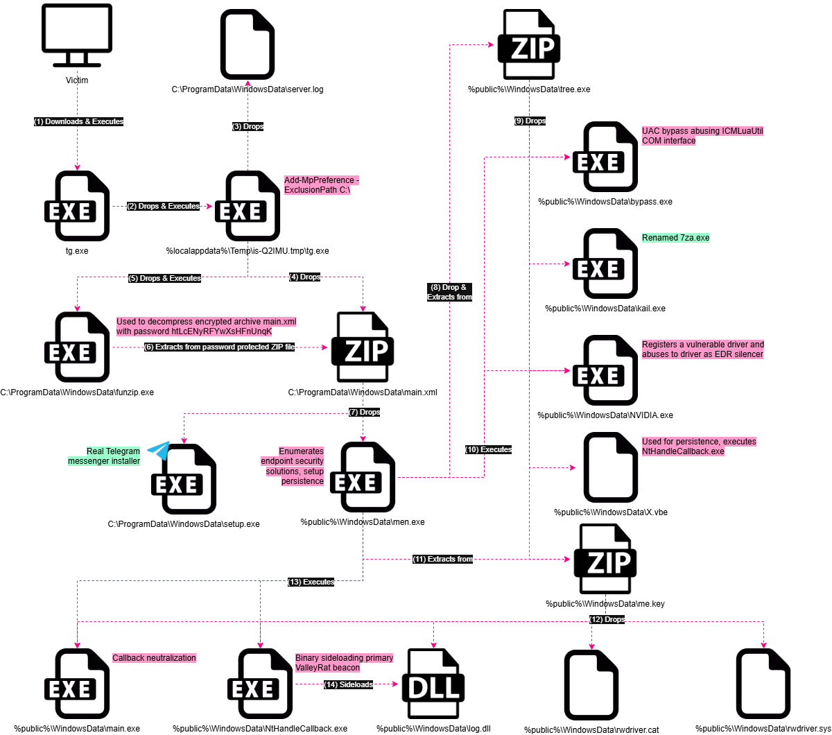 “Op het eerste gezicht zien slachtoffers een normale installateur”, zei Fielenbach. “Op de achtergrond zet de malware bestanden in scène, zet stuurprogramma’s in, knoeit met de verdediging en lanceert uiteindelijk een ValleyRat-baken dat langdurige toegang tot het systeem houdt.”