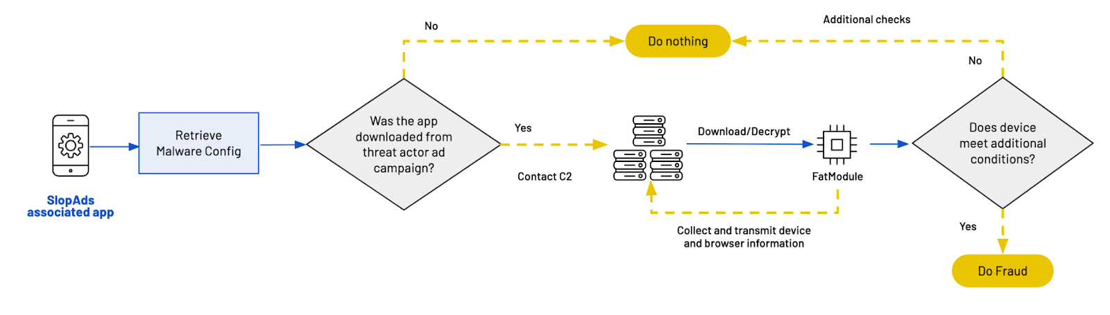De FATModule wordt geleverd door middel van vier PNG -afbeeldingsbestanden die de APK verbergen, die vervolgens wordt gedecodeerd en opnieuw wordt samengesteld om apparaat- en browserinformatie te verzamelen, en advertentiefraude uitvoeren met behulp van verborgen webviews.