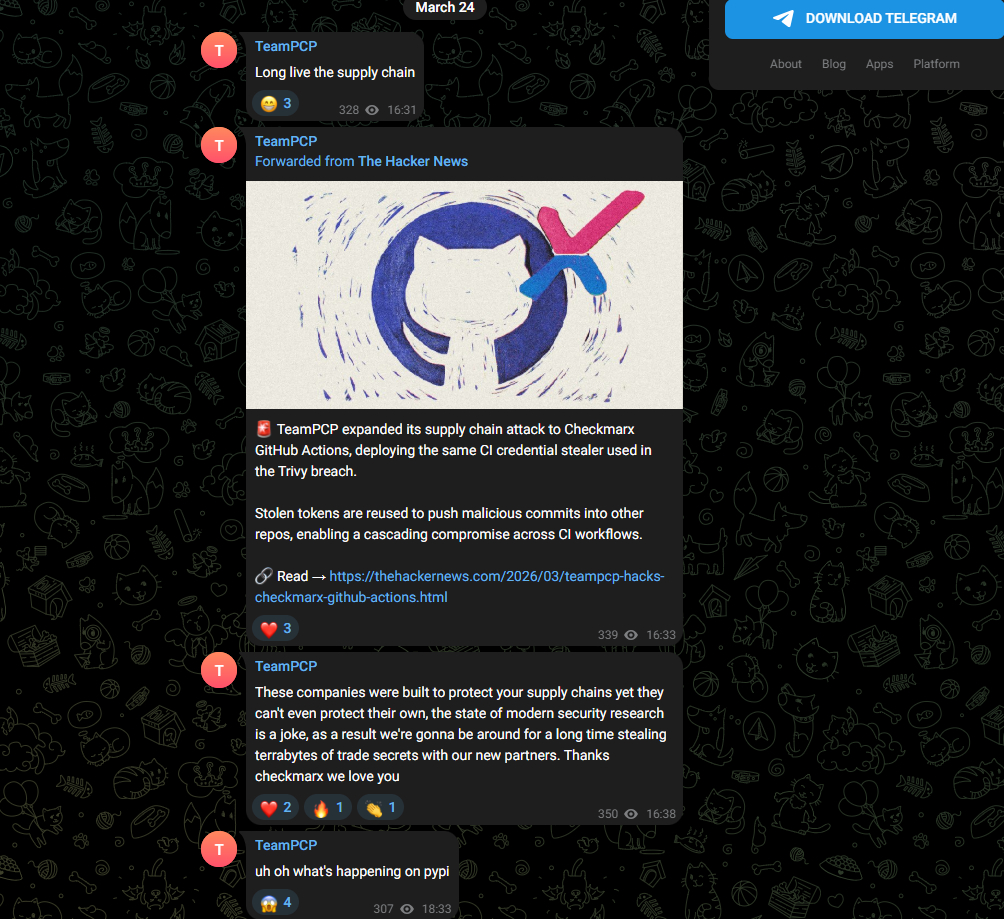 In een bericht op hun Telegram-kanaal zei TeamPCP: “Deze bedrijven zijn gebouwd om uw toeleveringsketens te beschermen, maar ze kunnen hun eigen toeleveringsketens niet eens beschermen. De stand van het moderne veiligheidsonderzoek is een grap, met als resultaat dat we nog een hele tijd terrabytes (sic) aan bedrijfsgeheimen zullen stelen met onze nieuwe partners.”