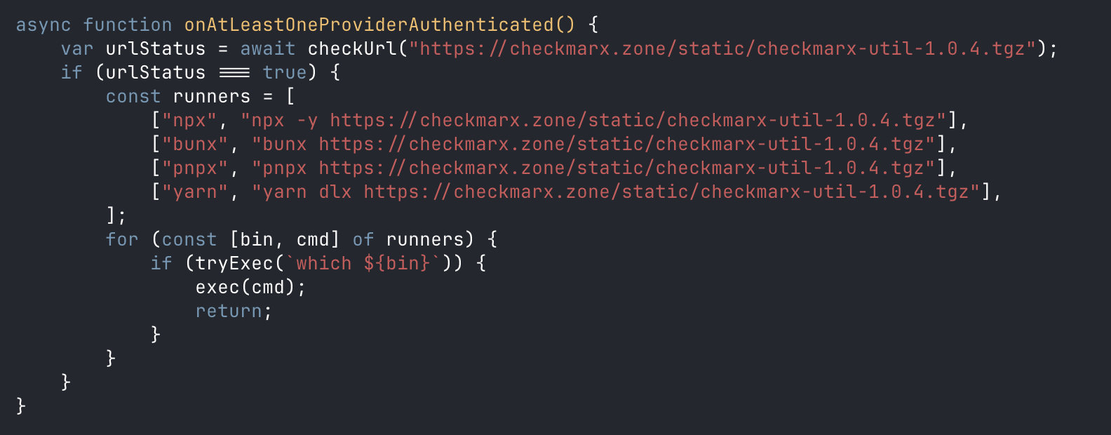“De payload probeert uitvoering via npx, bunx, pnpx of garen dlx. Dit omvat grote JavaScript-pakketbeheerders”, aldus Wiz-onderzoekers Rami McCarthy, James Haughom en Benjamin Read. “Het opgehaalde pakket bevat een uitgebreide inloggegevensdief. De verzamelde inloggegevens worden vervolgens gecodeerd, met behulp van de sleutels zoals elders in deze campagne, en geëxfiltreerd naar ‘checkmarx(.)zone/vsx’ als tpcp.tar.gz.”