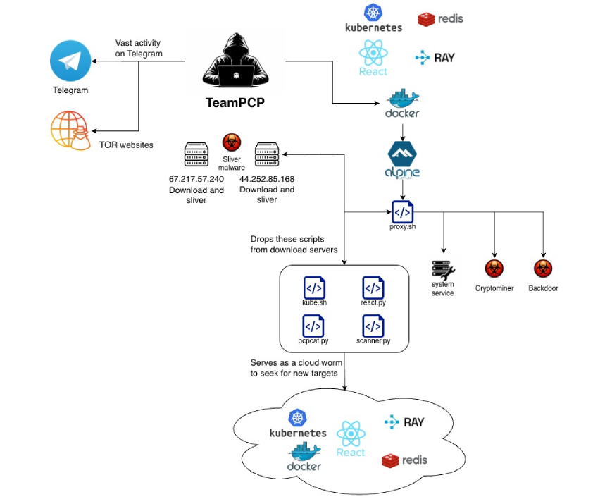 Er wordt gezegd dat TeamPCP functioneert als een cloud-native cybercriminaliteitsplatform, waarbij gebruik wordt gemaakt van verkeerd geconfigureerde Docker API’s, Kubernetes API’s, Ray-dashboards, Redis-servers en kwetsbare React/Next.js-applicaties als belangrijkste infectieroutes om de moderne cloudinfrastructuur te doorbreken om gegevensdiefstal en afpersing te vergemakkelijken.