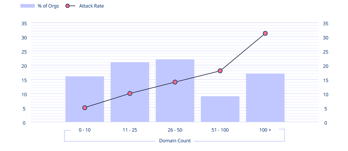 Dit kunnen we duidelijk zien in onderstaande grafiek. Het aanvalspercentage stijgt lineair van 5% (0-10 domeinen) naar 18% (51-100 domeinen) en stijgt vervolgens steil voorbij de 100 domeinen.