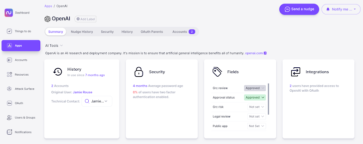 Nudge Security biedt een samenvattend overzicht van elke applicatie, zodat u nieuwe AI-tools snel kunt beoordelen. U kunt een korte beschrijving van de app bekijken, zien hoeveel accounts en integraties er zijn gemaakt door leden van uw organisatie, de oorspronkelijke gebruiker identificeren en de beveiligingshygiëne van uw gebruikers controleren. Als u op elk tabblad in het menu inzoomt, krijgt u nog meer informatie ter ondersteuning van uw evaluaties. Terwijl u uw beoordelingen voltooit, kunt u de status bijwerken in het gedeelte ‘Velden’ om statussen en goedkeuringen bij te houden.