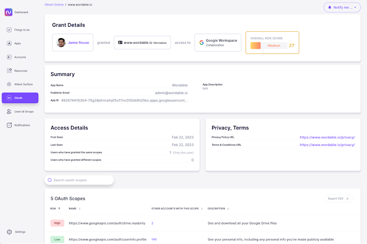 Daarom maakt Nudge Security de reikwijdten openbaar die aan elke applicatie zijn toegekend en biedt het OAuth-risicoscores om u te helpen risicovolle OAuth-toekenningen snel te identificeren. De oplossing biedt voldoende context om u te helpen precies te begrijpen welke toegang en rechten elke gebruiker heeft verleend en wat dit betekent voor uw organisatie, zodat u kunt ingrijpen als een applicatie te veel toegang heeft.
